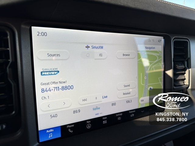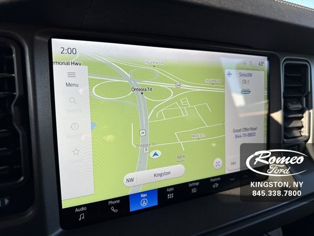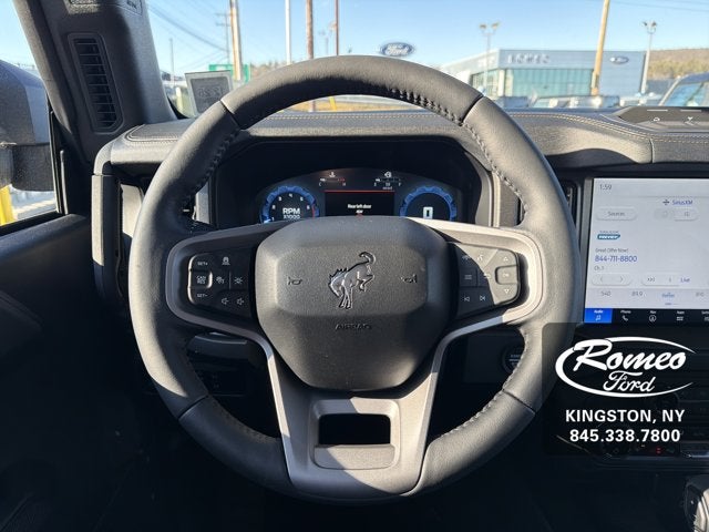 Scores 19 Highway MPG and 17 City MPG! This Ford Bronco delivers a Twin Turbo Regular Unleaded V-6 2.7 L/164 engine powering this Automatic transmission. SHADOW BLACK PAINTED HARD TOP -inc: Hard Top Sound Deadening Headliner, Rear-Window Defroster & Washer, FRONT LICENSE PLATE BRACKET -inc: Standard in states requiring 2 license plates and optional to all others, EQUIPMENT GROUP 334A LUX PACKAGE -inc: Rear Parking Sensors, Power Outlet - Back Side of Center Floor Console, Dr & Pass Illuminated Sliding Visor Vanity Mirrors, Evasive Steering Assist, Information on Demand Panel, Dual-Zone Electronic Automatic Temperature Control, air conditioning, Ford Co-Pilot360, Enables compatibility w/FordPass performance app w/off-road navigation, Auto High-Beam Headlamps, Pre-Collision Assist w/Automatic Emergency Braking, pedestrian detection, forward collision warning and dynamic brake support, Blind Spot Information System (BLIS), Cross-Traffic Alert, Rear View Camera, backup assist grid lines, Lane-Keeping System, Lane-Keeping Alert, Lane-Keeping Aid and Driver Alert, Ambient Footwell Lighting, 2-Door Intelligent Access w/Lock/Unlock, Intelligent Access will also lock/unlock the swing gate, Dual Smart Charging USB Ports, Front Row Heated Seats, Adaptive Cruise Control, Radio: B&O Sound System by Bang & Olufsen, 12 speakers including subwoofer, Connected.*This Ford Bronco Comes Equipped with These Options *DOOR STORAGE BAGS -inc: Custom accessory, pre-installed, The door storage bags are unique to the number of doors, On-vehicle door storage is 4-door only, Wireless Phone Connectivity, Wheels: 17 Carbonized Gray-Painted Aluminum, Vinyl/Rubber Floor Trim, Variable Intermittent Wipers, Upfitter Switches, Trip Computer, Transmission: 7-Speed Manual -inc: granny gear and crank in gear function and Hill Descent Control, Tracker System, Towing Equipment -inc: Trailer Sway Control.* Stop By Today *Come in for a quick visit at Romeo Ford of Kingston, 128 Route 28, Kingston, NY 12401 to claim your Ford Bronco!