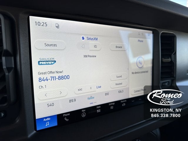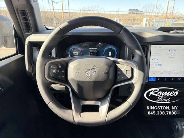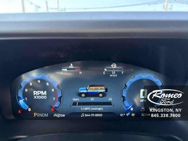 Boasts 19 Highway MPG and 17 City MPG! This Ford Bronco boasts a Twin Turbo Regular Unleaded V-6 2.7 L/164 engine powering this Automatic transmission. TRANSMISSION: 10-SPEED AUTOMATIC -inc: trail control, trail turn assist and trail one-pedal driving, 4.46 Axle Ratio, SIRIUSXM W/360L (3-YEAR PLAN) -inc: SiriusXM w/360L (3-year plan), also referred to as an extended service subscription plan by SiriusXM, is included w/your newly purchased or leased vehicle will stop at the end of your subscription period unless you decide to continue service, Plan is non-transferrable and non-refundable, If you do not wish to enjoy your subscription, you can cancel by calling the number below, All SiriusXM services require a subscription, each sold separately by SiriusXM after the service term, Service subject to the SiriusXM customer agreement and privacy policy, visit siriusxm.com for complete terms and how to cancel which includes online methods or calling 1-866-635-2349, Some services and features are subject to device capabilities and location availability, Satellite service not available in Alaska and Hawaii, Certain features and/or content may not be available in vehicles w/SiriusXM w/360L unless an active data connection is enabled in the vehicle, Content va, HARD TOP SOUND DEADENING HEADLINER.*This Ford Bronco Comes Equipped with These Options *EQUIPMENT GROUP 334A LUX PACKAGE -inc: Rear Parking Sensors, Pro Power Onboard - 400W, Back side of center floor console, Dr & Pass Illuminated Sliding Visor Vanity Mirrors, Evasive Steering Assist, Heated Steering Wheel, Information on Demand Panel, Dual-Zone Electronic Automatic Temperature Control, air conditioning, Ford Co-Pilot360, Auto High-Beam Headlamps, Pre-Collision Assist w/Automatic Emergency Braking, pedestrian detection, forward collision warning and dynamic brake support, Blind Spot Information System (BLIS), Cross-Traffic Alert, Rear View Camera, backup assist grid lines, Lane-Keeping System, Lane-Keeping Alert, Lane-Keeping Aid and Driver Alert, Ambient Footwell Lighting, 2-Door Intelligent Access w/Lock/Unlock, Intelligent Access will also lock/unlock the swing gate, Dual Smart Charging USB Ports, Front Row Heated Seats, Adaptive Cruise Control, Radio: B&O Sound System by Bang & Olufsen, 12 speakers including subwoofer, Connected Navigation, Ford connectivity package, FRONT LICENSE PLATE BRACKET -inc: Standard in states requiring 2 license plates and optional to all others, ENGINE: 2.7L ECOBOOST V6 -inc: GVWR: 6,180 lbs, CARBONIZED GRAY MOLDED-IN-COLOR HA
